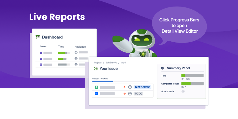 Using dashboard gadgets and the Summary Panel, administrators are able to add live reports (progress bars), to almost anywhere in Jira.