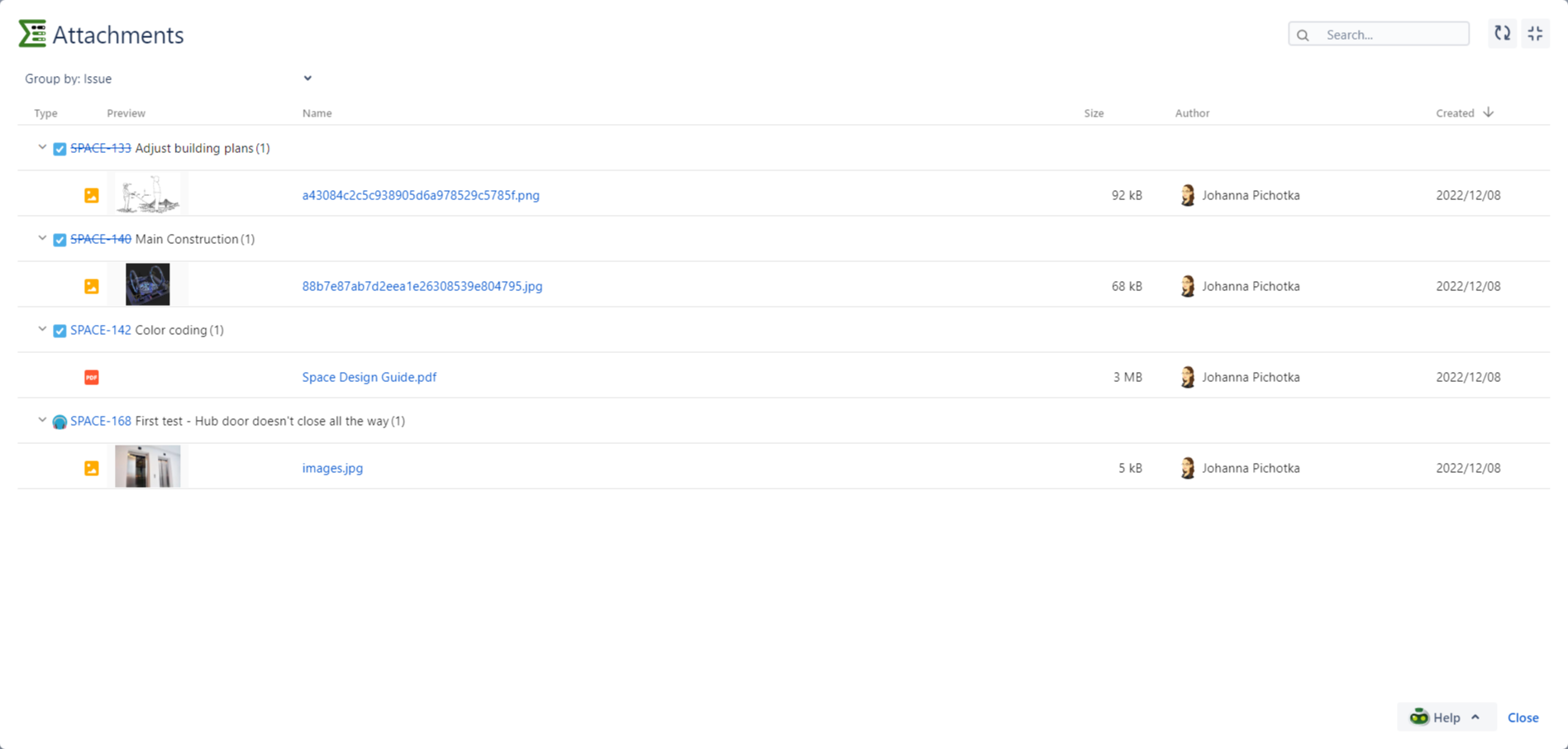 Group by Issue, Author or Created date