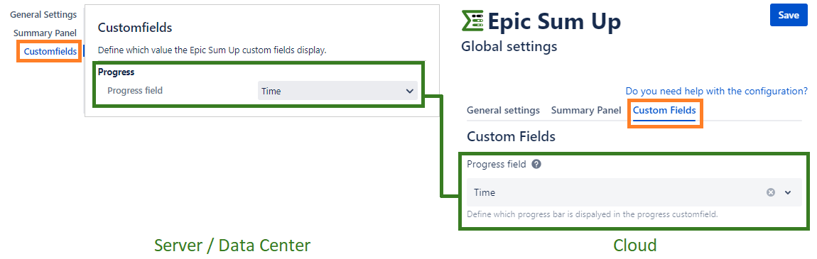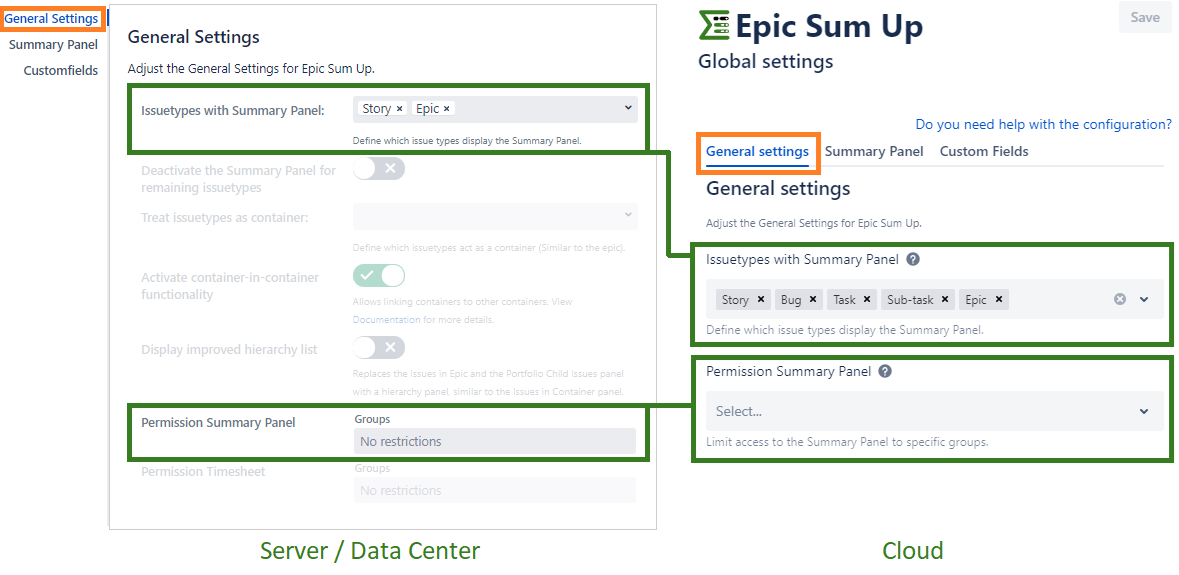 On the left side of each illustration you will find the settings of Epic Sum Up Server/Data Center and on the right the corresponding setting in Jira Cloud.