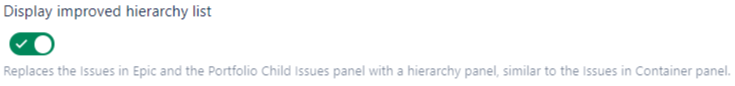 If this functionality is activated the Issues in epic / Portfolio issue panel will be replaced with a hierarchy panel. This hierarchy panel works like the issues in container list.