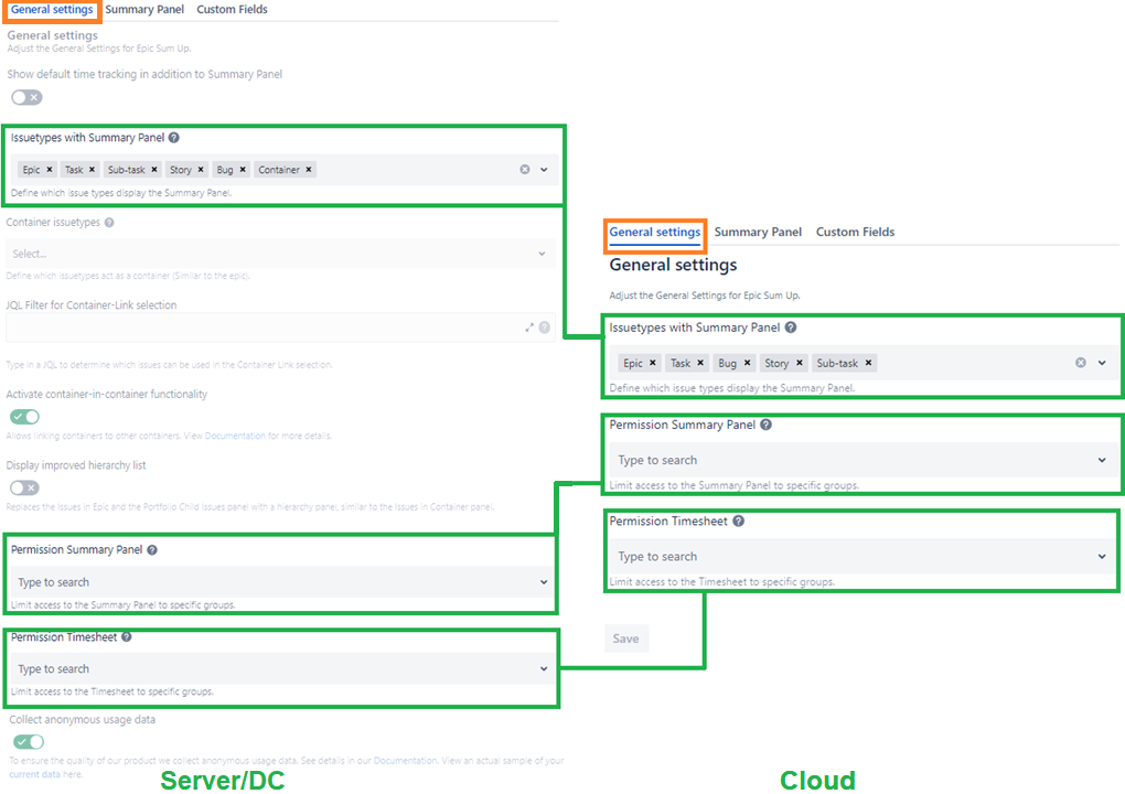 On the left side of each illustration you will find the settings of Epic Sum Up Server/Data Center and on the right the corresponding setting in Jira Cloud.