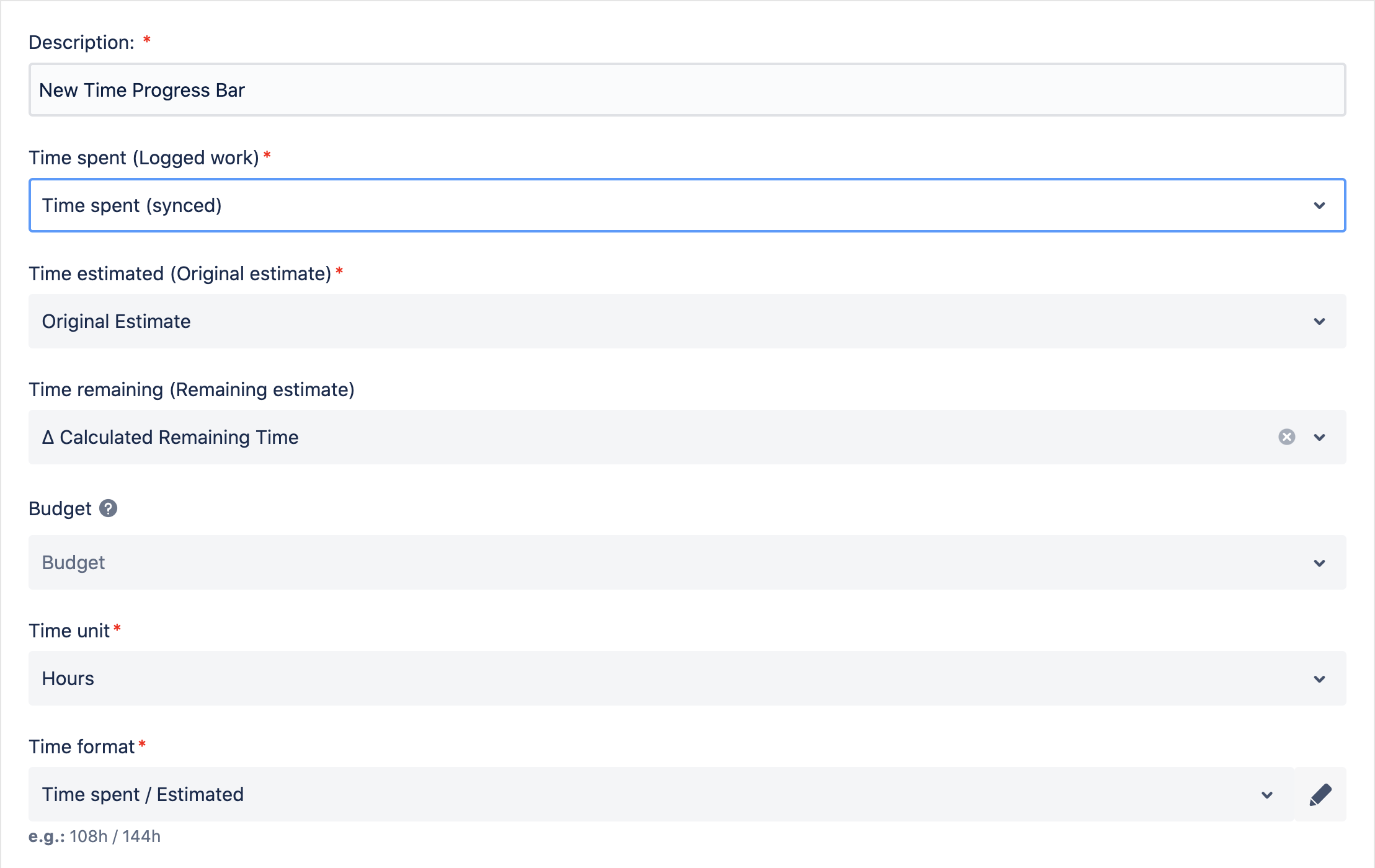Within the custom time progress bar configuration, the first step is to name the progress bar. Then you can select time custom fields for the time estimation, time remaining and the time spent.