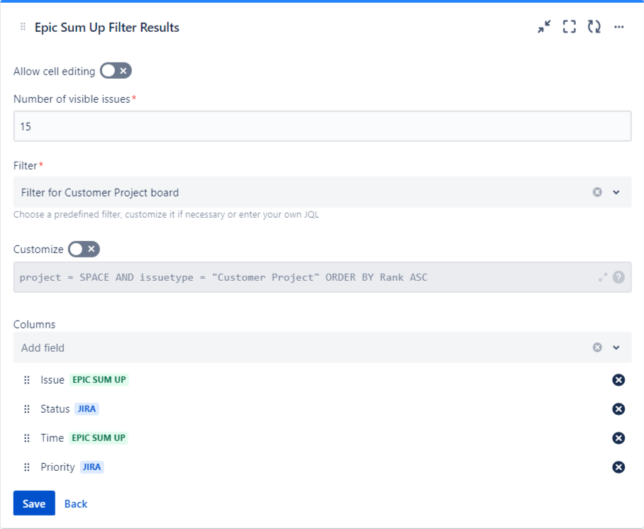 With this new JQL field you can edit your dashboard gadget filter directly from the gadget configuration or define custom JQL when adding a new gadget to your dashboard.