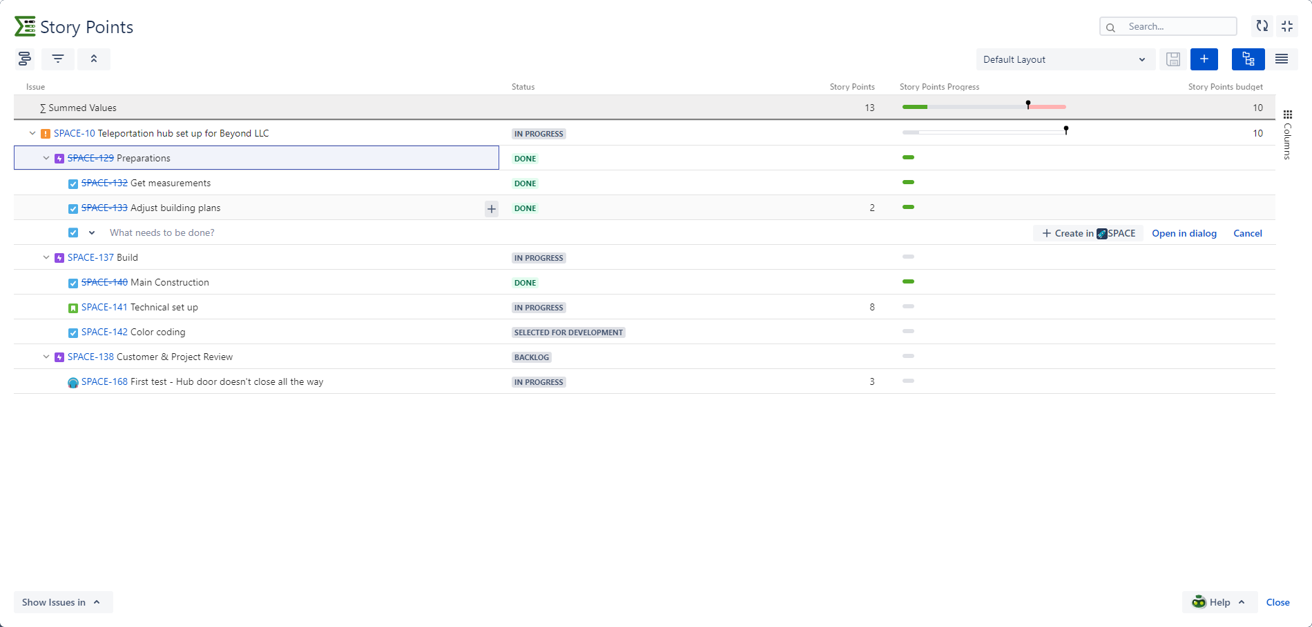 To create a new issue, click on the plus on the right side of the issue column. Select the issue type first, then type in a summary and to save press enter. The created issue will now appear in the hierarchy.