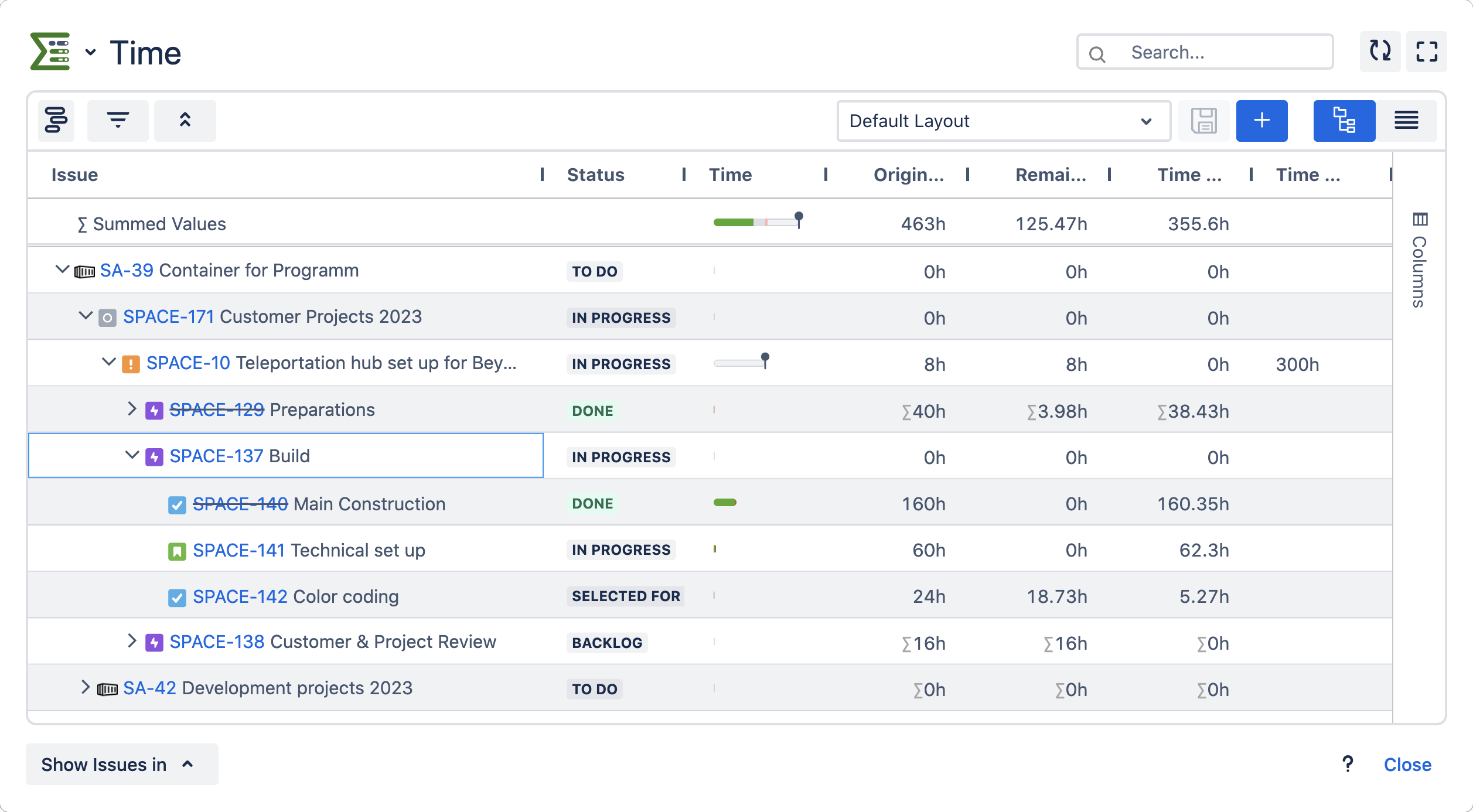 To start using containers, navigate to the global settings of Epic Sum Up and select the container tab. Here you can choose the issue types that can be used to build container structures. The next step is to define which link types are used to link containers to other issues and vice versa. Read more about the configuration on this page.