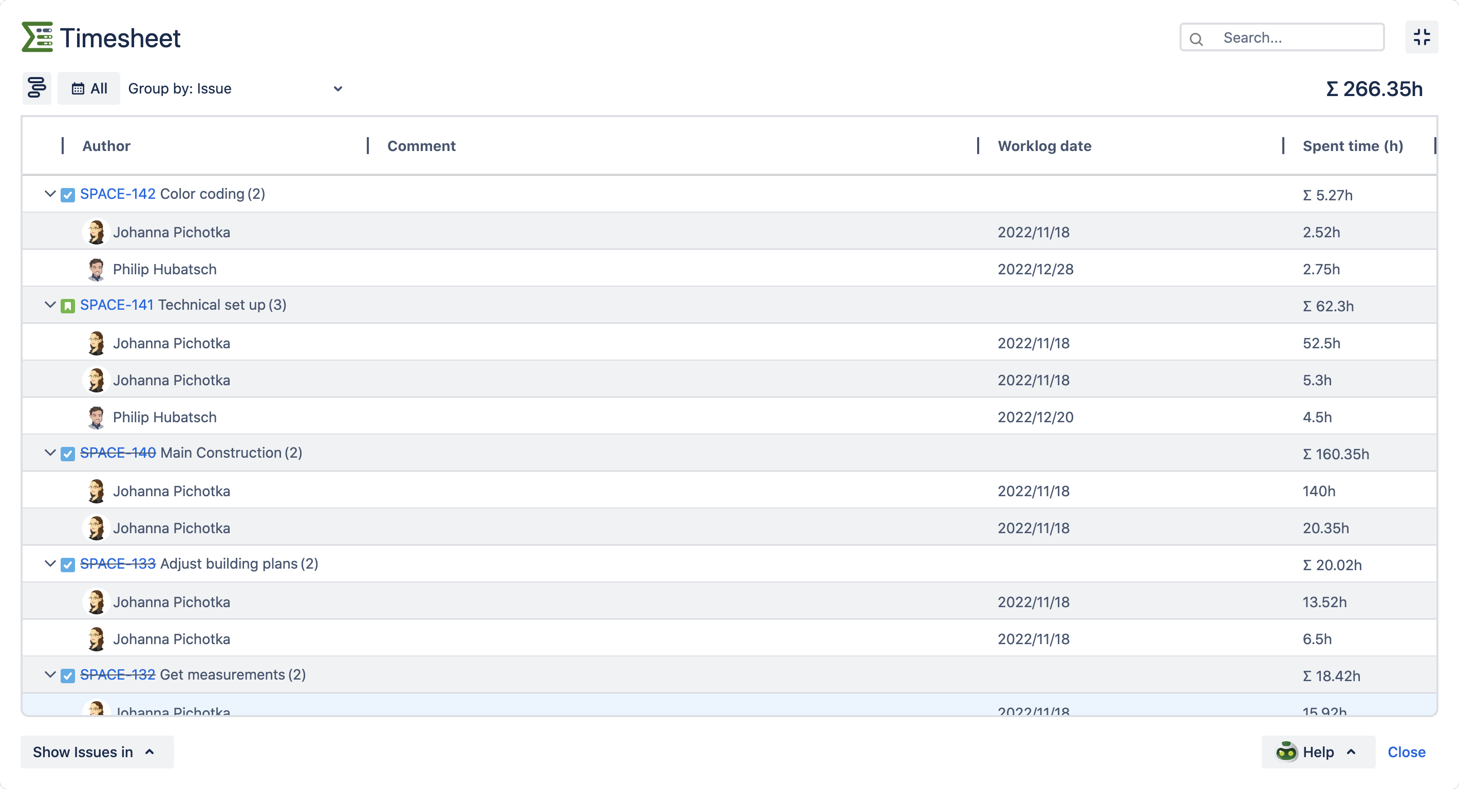 2. Group your worklogs - by default, worklogs are grouped by issue. However, they can also be grouped by author or date.