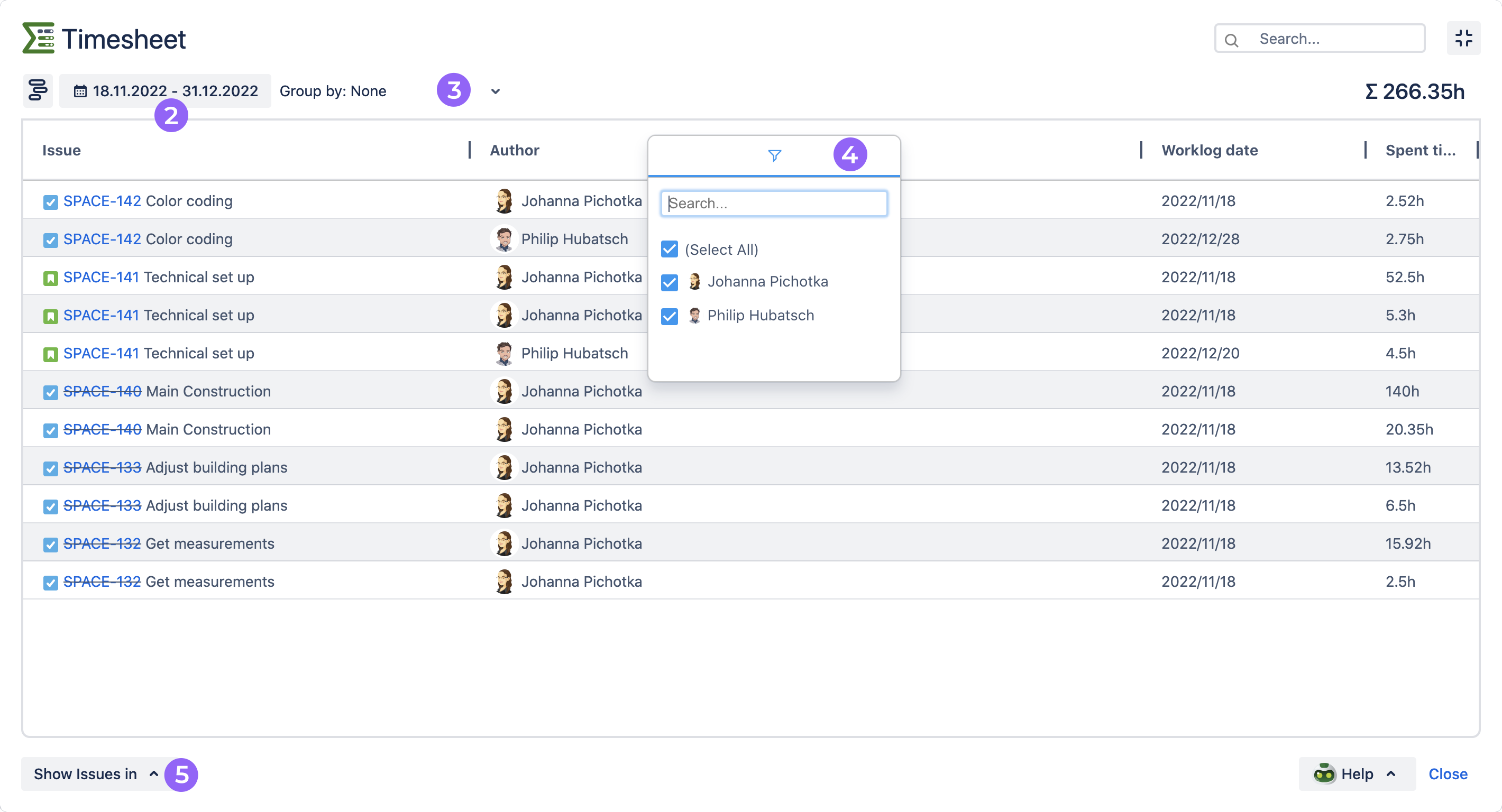 Within the filter menu for e.g. the Author you can select, or deselect certain team members - this is useful if you want to sort your worklog report to only include specific roles within your team. In order for this menu to appear on the column header, you need to set the grouping option to Group by: None.