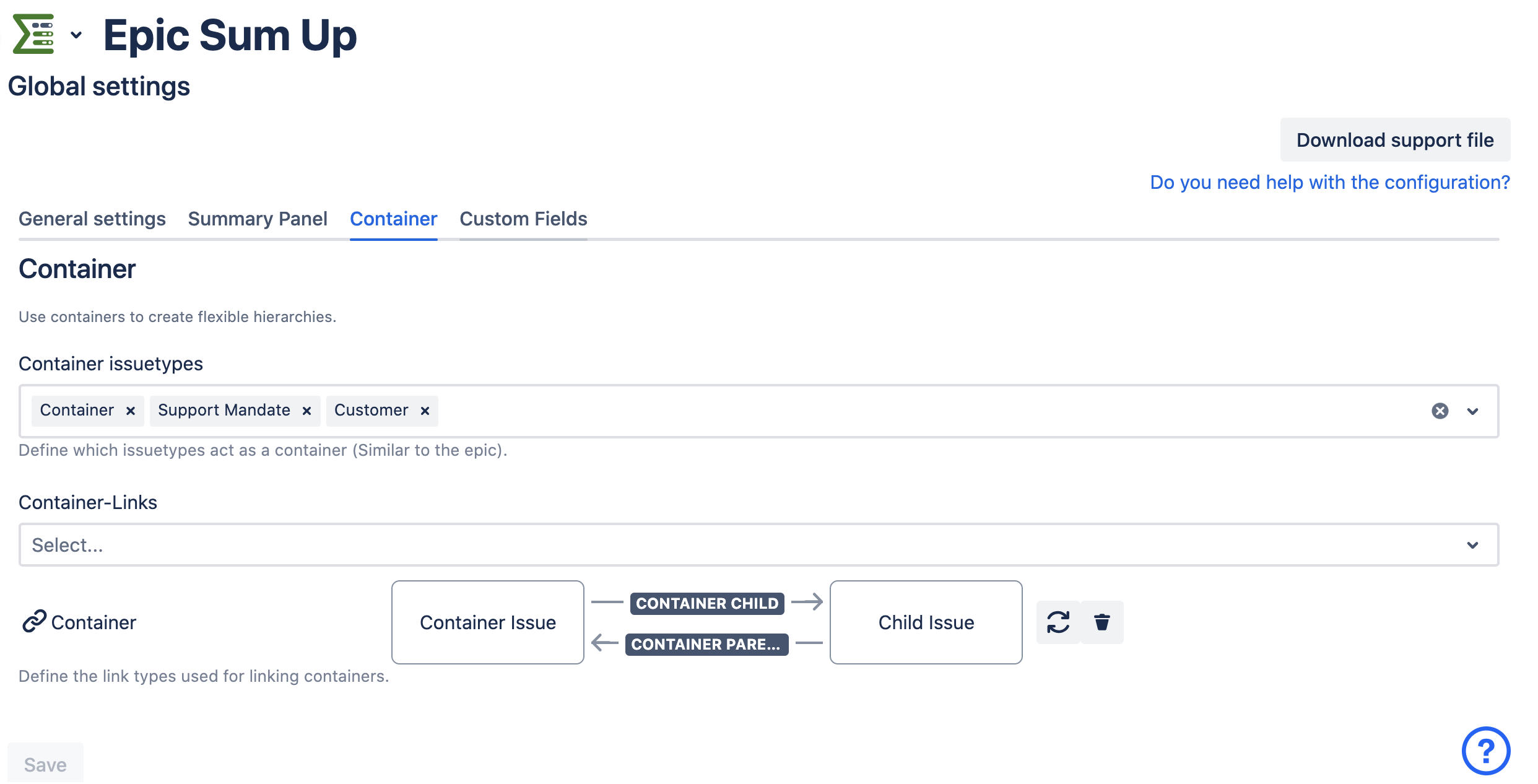Define which issue types can be used as containers. Only the issue types set here can become a container parent to other issues or containers.